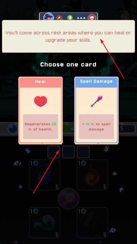 4、遇休息區(qū)選卡牌,血量吃緊選治療卡回20%生命,追求輸出選法術(shù)傷害卡增10% spell damage,強(qiáng)化后續(xù)戰(zhàn)力。