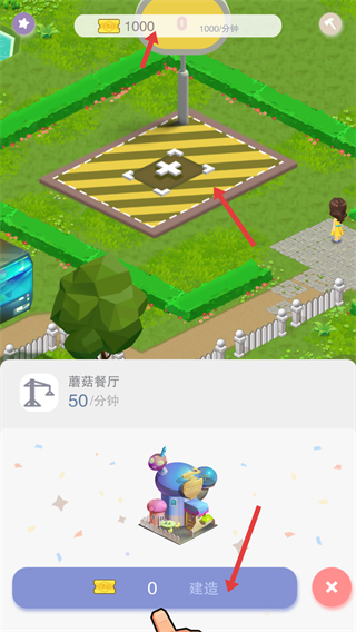 2、選擇要建造的建筑如蘑菇餐廳,確認擁有足夠資源后,點擊建造按鈕即可開始建筑的搭建,等待建造完成。