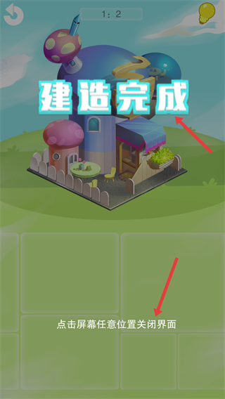 4、當建筑及裝飾都布置好后會顯示建造完成,此時點擊屏幕任意位置可關(guān)閉建造完成界面,回到主場景繼續(xù)游戲。