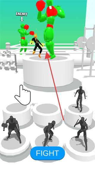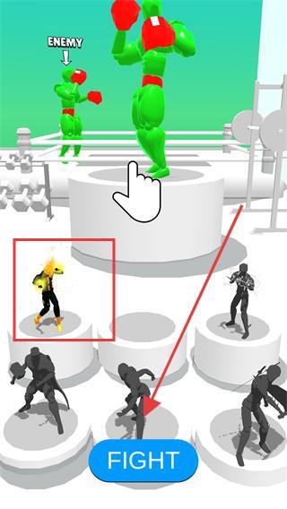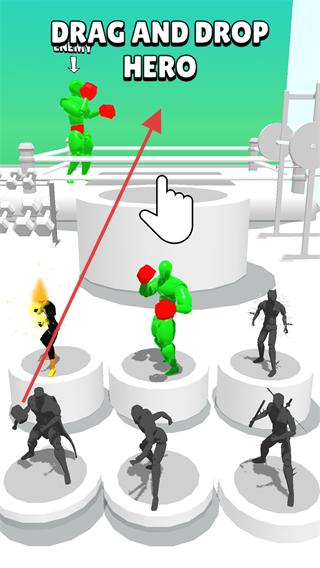 4、若當(dāng)前英雄戰(zhàn)斗結(jié)束可再次從下方選擇其他英雄,拖拽到對戰(zhàn)區(qū)域,點擊FIGHT按鈕,讓新的英雄繼續(xù)與敵人戰(zhàn)斗,不斷進行英雄對戰(zhàn),推進游戲進程。