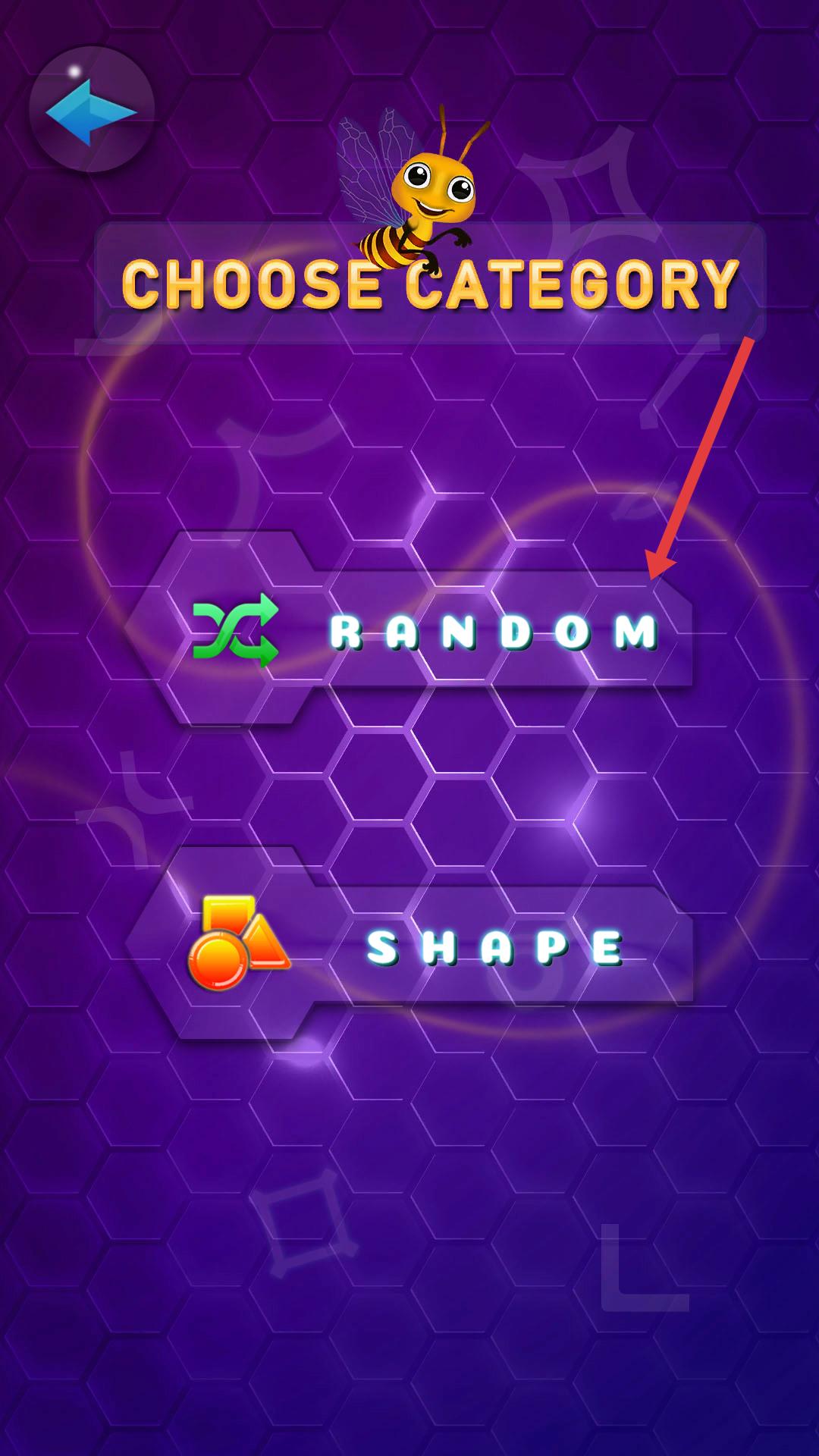 2、進(jìn)入類別選擇界面,有RANDOM和SHAPE選項(xiàng),選擇RANDOM可隨機(jī)進(jìn)入游戲關(guān)卡,體驗(yàn)不同挑戰(zhàn)。