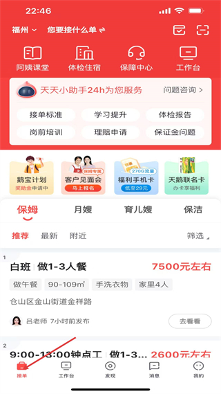 1、接單頁福州,有阿姨課堂等功能入口,服務(wù)涵蓋保姆、月嫂等,展示白班做餐等訂單,可接單找家政服務(wù)。