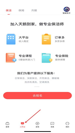 2、工作臺頁保潔板塊,介紹加入平臺做保潔師的優(yōu)勢,提供日常保潔等服務(wù),可報名成為專業(yè)保潔師。