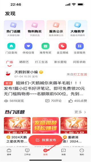 3、發(fā)現(xiàn)頁有熱門話題等功能入口,廣場展示平臺活動,可參與話題、發(fā)布內(nèi)容,還可物料購買、看大咖教學(xué)。