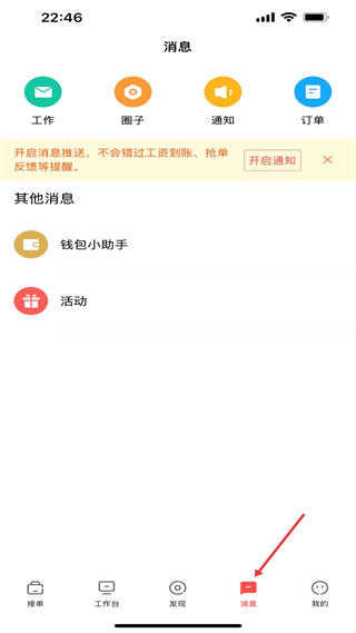 4、消息頁有工作、圈子等分類,可開啟通知收工資到賬等提醒,還有錢包小助手、活動等其他消息。