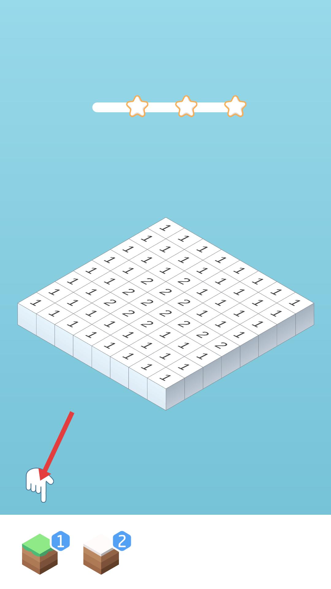 1、游戲界面顯示帶數(shù)字的方塊矩陣,下方有標(biāo)1和2的方塊,根據(jù)提示,點(diǎn)擊下方標(biāo)1的方塊,為后續(xù)操作做準(zhǔn)備。