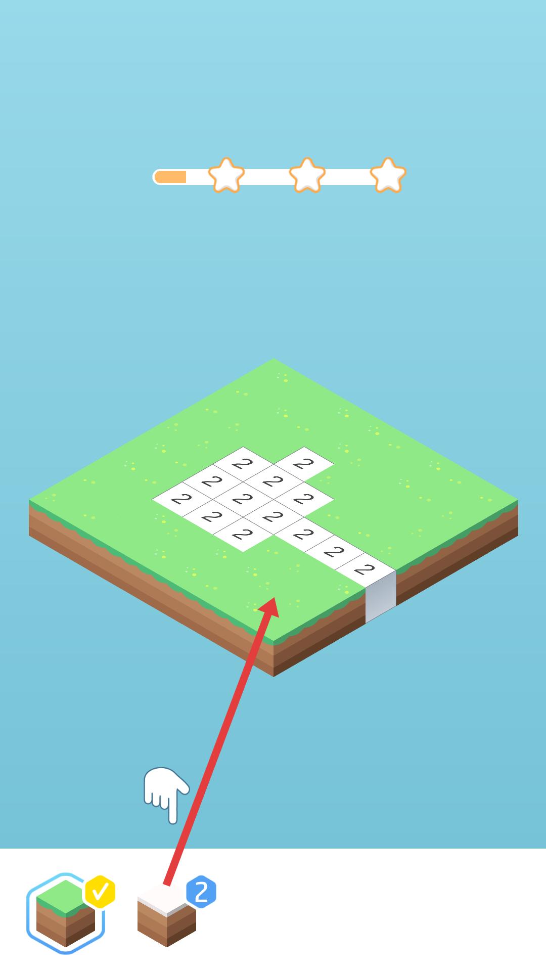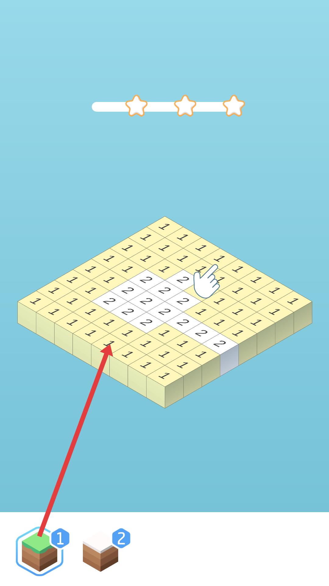 3、選擇下方標(biāo)2的方塊,對(duì)矩陣中數(shù)字2的區(qū)域進(jìn)行填充,使場(chǎng)景進(jìn)一步完善,靠近通關(guān)狀態(tài)。