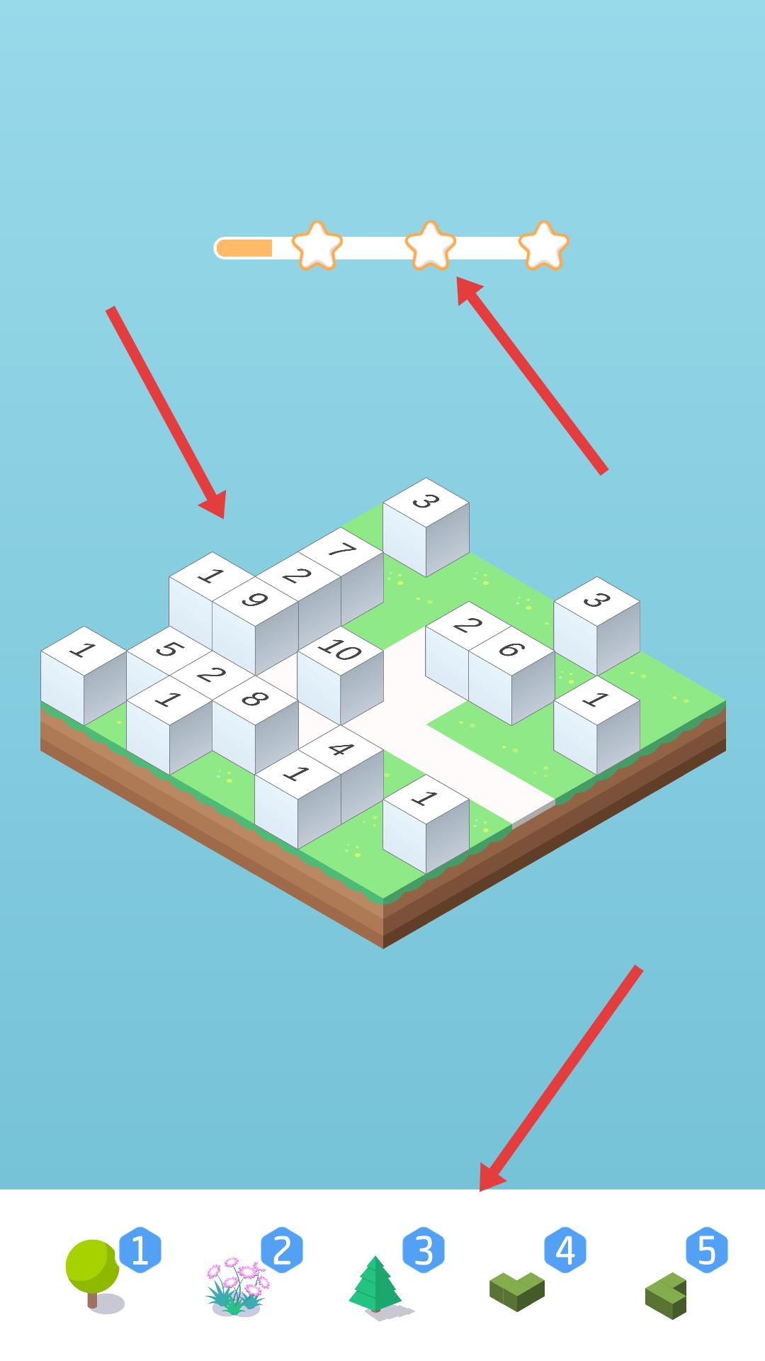 4、填充完成后場(chǎng)景出現(xiàn)帶有不同數(shù)字的立體方塊,下方有樹木、花朵等不同標(biāo)識(shí)的選項(xiàng),可根據(jù)方塊數(shù)字選擇對(duì)應(yīng)標(biāo)識(shí)布置。