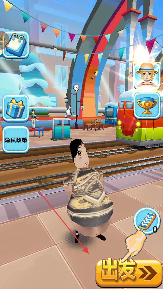 1、面對出發(fā)界面,點擊出發(fā),角色在軌道跑酷,躲避火車、障礙,收集金幣,完成任務(wù)。