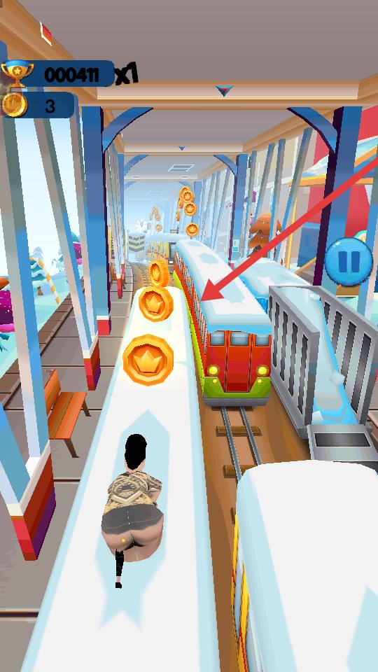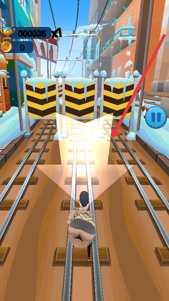 3、游戲跑酷場景,軌道有火車,操作角色變道,躲避火車,收集金幣,提升分數(shù)。