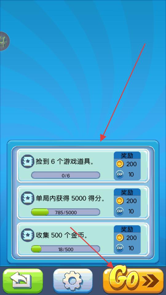 4、玩軌道跑酷,點擊GO,開始跑酷,完成任務(wù),收集道具、金幣,提升分數(shù),獲取獎勵,積累資源。