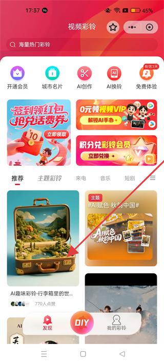 1、進(jìn)入首頁可瀏覽推薦的各類視頻彩鈴如AI趣味彩鈴等,點(diǎn)擊感興趣的彩鈴,進(jìn)入彩鈴詳情頁面。