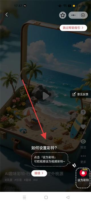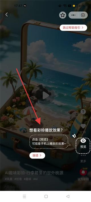 2、在彩鈴詳情頁面可查看如何設(shè)置彩鈴的提示,點(diǎn)擊繼續(xù)按鈕了解設(shè)置流程也可點(diǎn)擊預(yù)覽按鈕,觀看彩鈴播放效果。