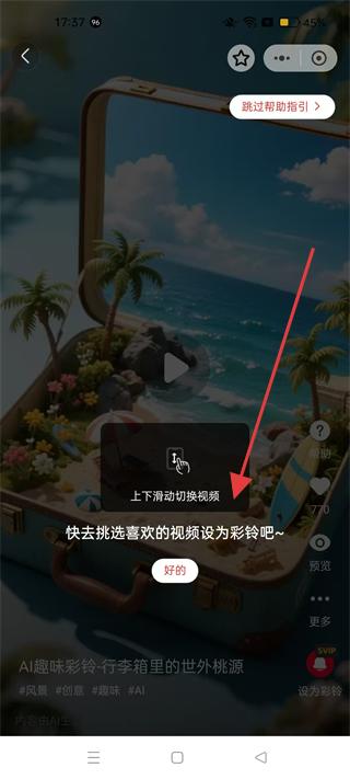 3、在提示頁面可學(xué)習(xí)上下滑動切換視頻的操作方法點(diǎn)擊好的按鈕,關(guān)閉提示繼續(xù)瀏覽彩鈴內(nèi)容。