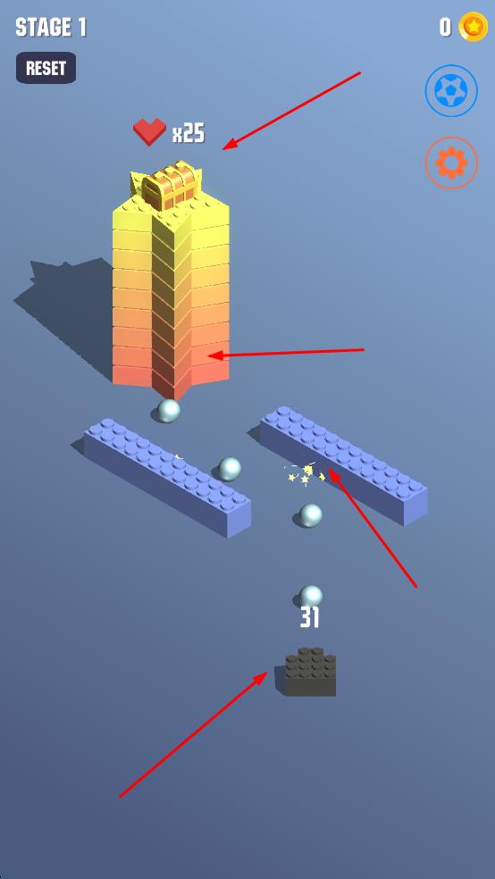 2、挑戰(zhàn)Stage1時,瞄準磚塊塔薄弱處發(fā)射彈珠,利用彈跳連鎖破壞,關(guān)注上方血量進度,逐步瓦解建筑結(jié)構(gòu),優(yōu)先擊破關(guān)鍵位置獲取頂部寶箱。