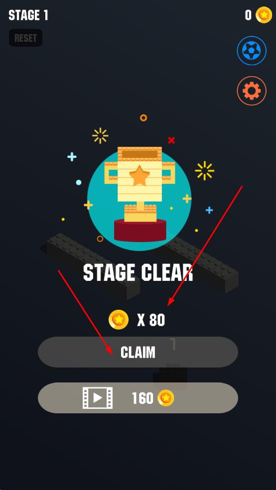 3、Stage1通關(guān)后,點擊CLAIM直接領(lǐng)取80金幣,也可觀看廣告翻倍獎勵,建議優(yōu)先領(lǐng)取基礎(chǔ)金幣,積累資源用于解鎖道具或新彈珠。