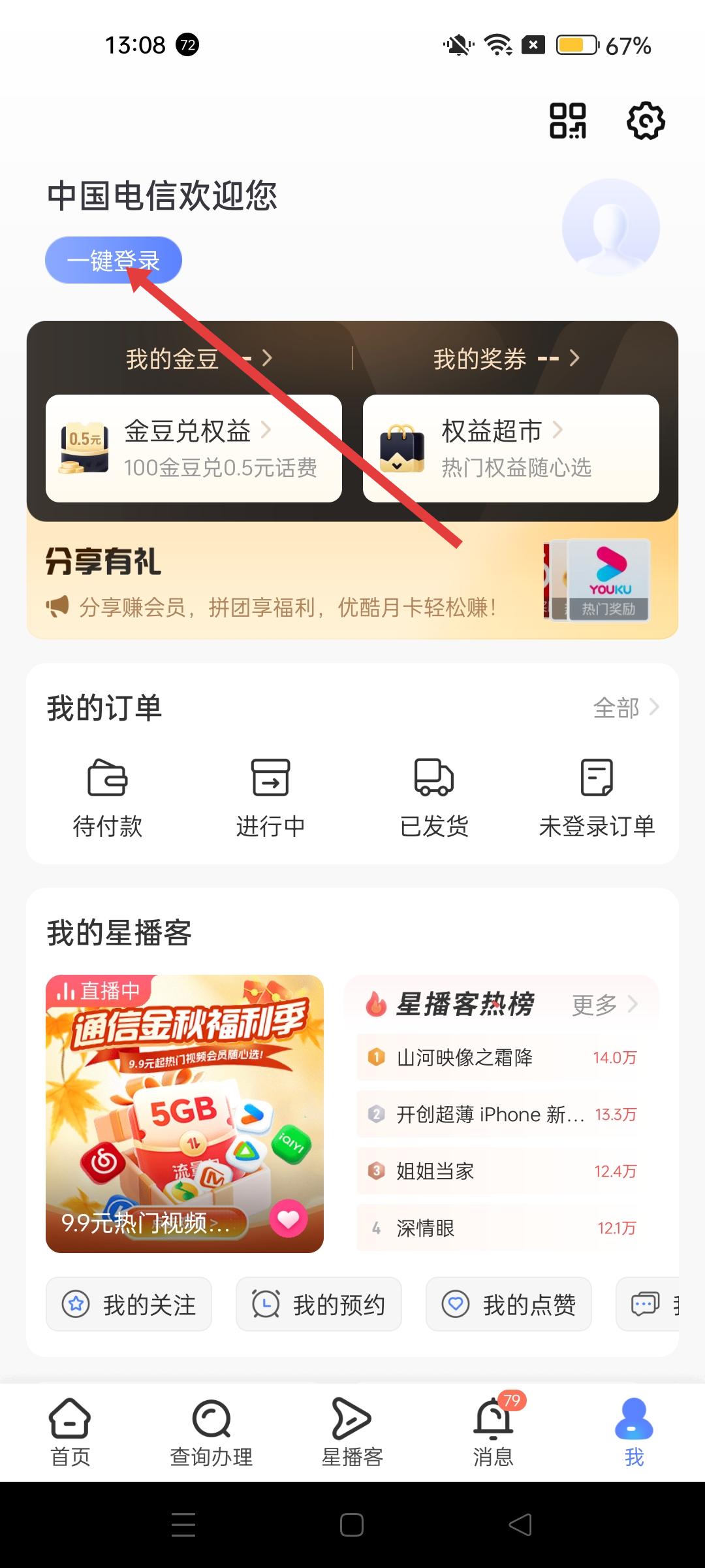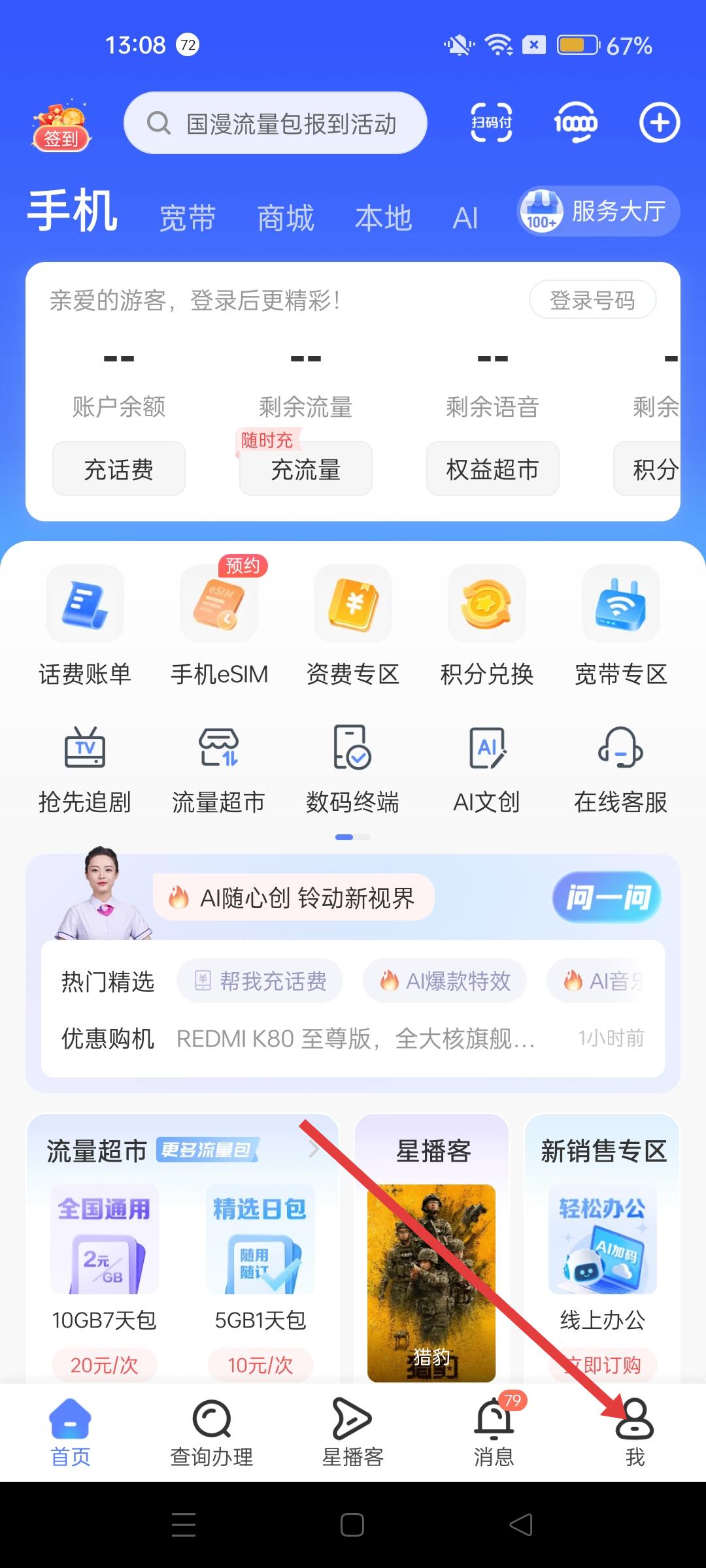 1、打開中國電信APP進(jìn)入首頁,點(diǎn)擊右下角我,進(jìn)入個(gè)人頁面,開始登錄流程。