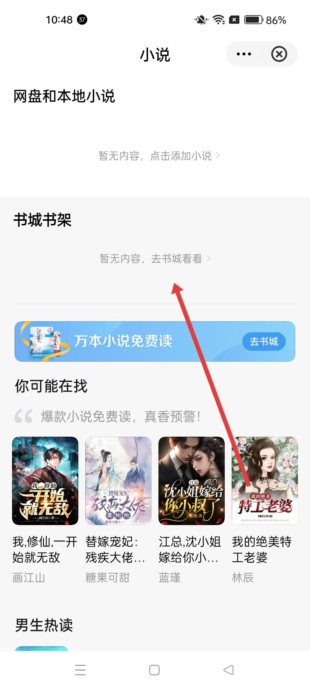 2、小說頁面,點(diǎn)擊書城書架區(qū)域的去書城看看,進(jìn)入在線書城頁面,準(zhǔn)備選擇小說。