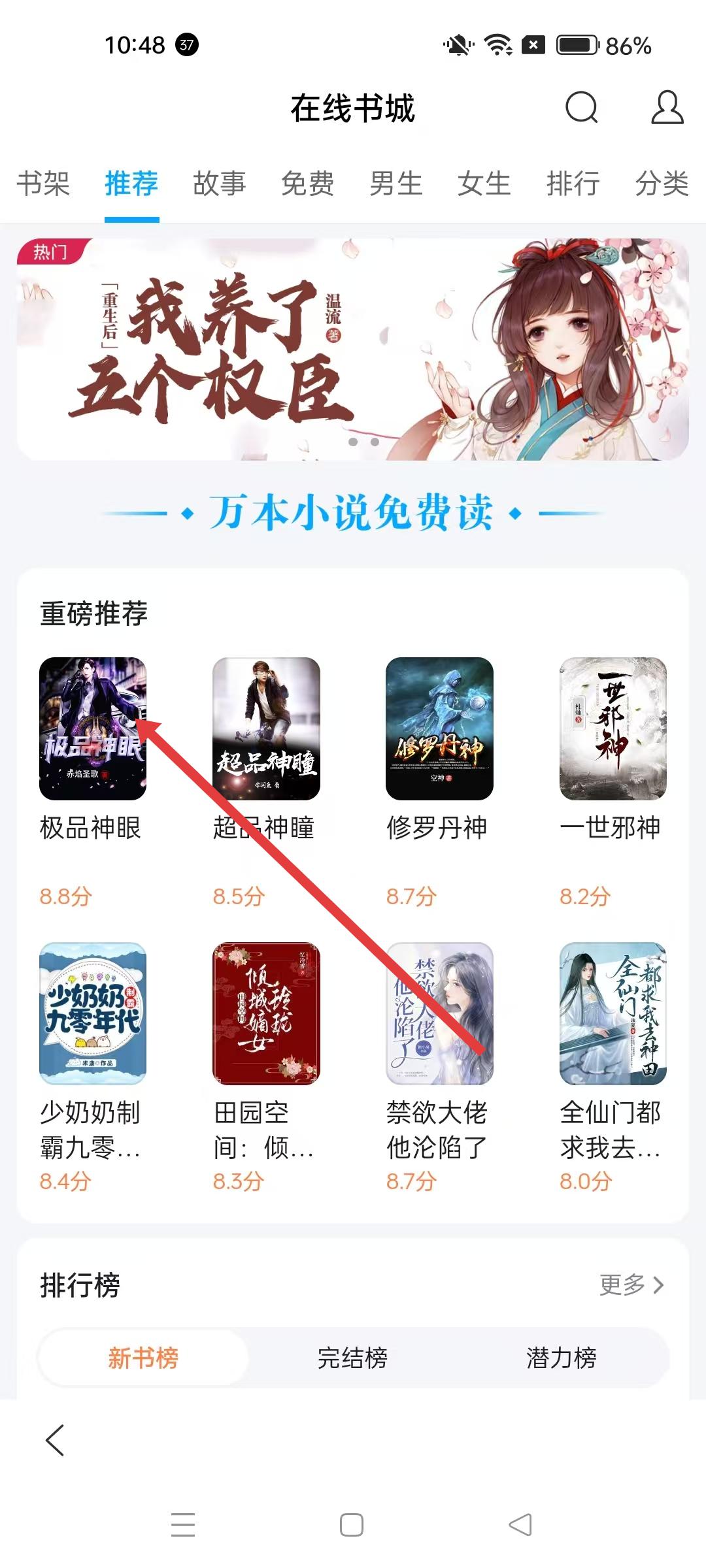 3、在線書城頁面,點(diǎn)擊重磅推薦里的極品神眼小說,進(jìn)入小說詳情頁面,準(zhǔn)備試讀。