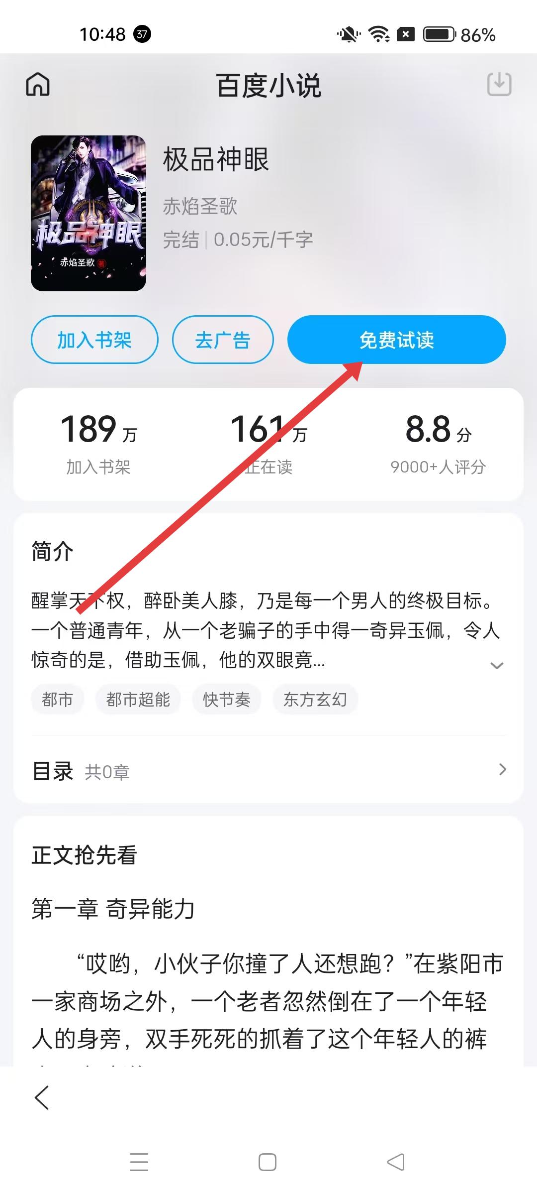 4、小說詳情頁面,點(diǎn)擊免費(fèi)試讀按鈕,即可開始閱讀極品神眼小說。