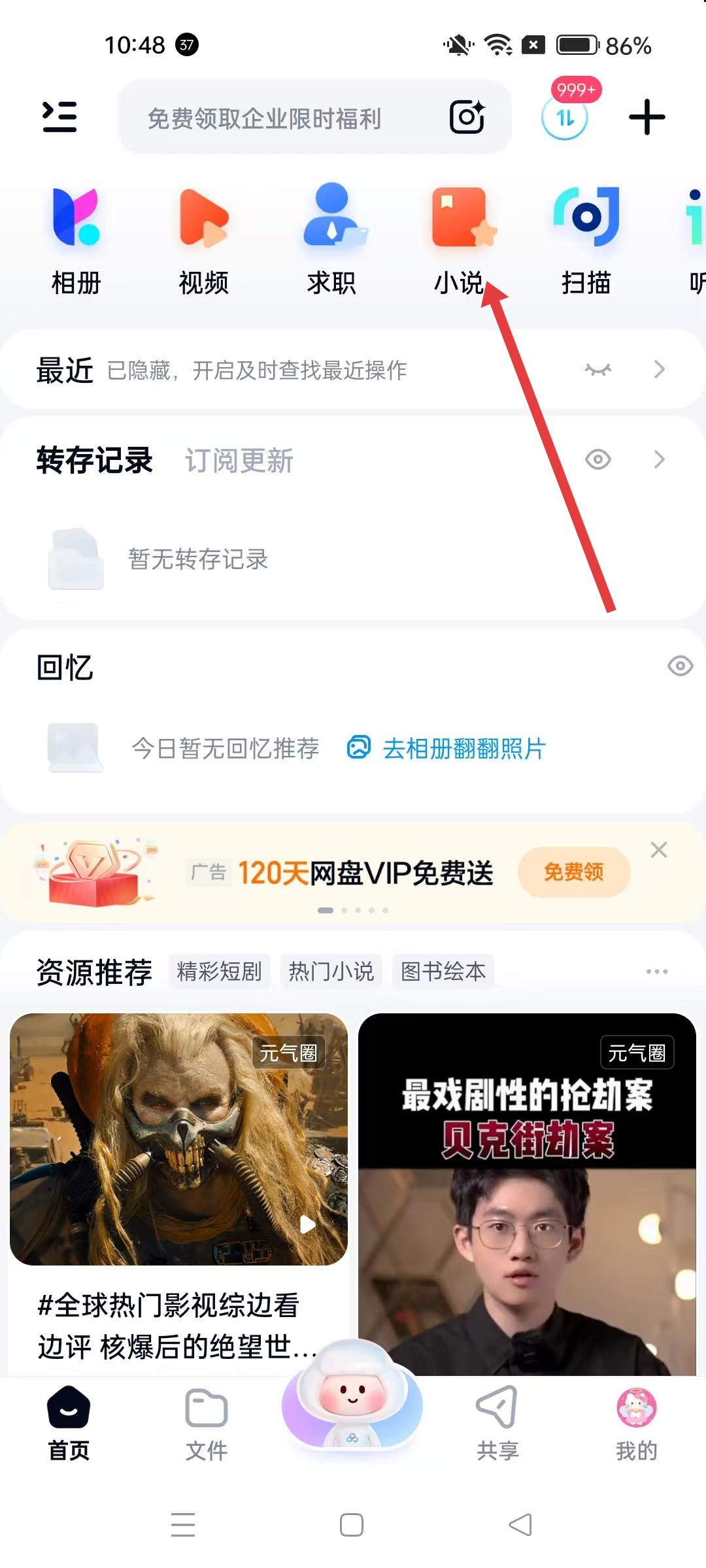 1、打開網(wǎng)盤后,點(diǎn)擊首頁的小說圖標(biāo),進(jìn)入小說頁面,開啟免費(fèi)試讀操作。