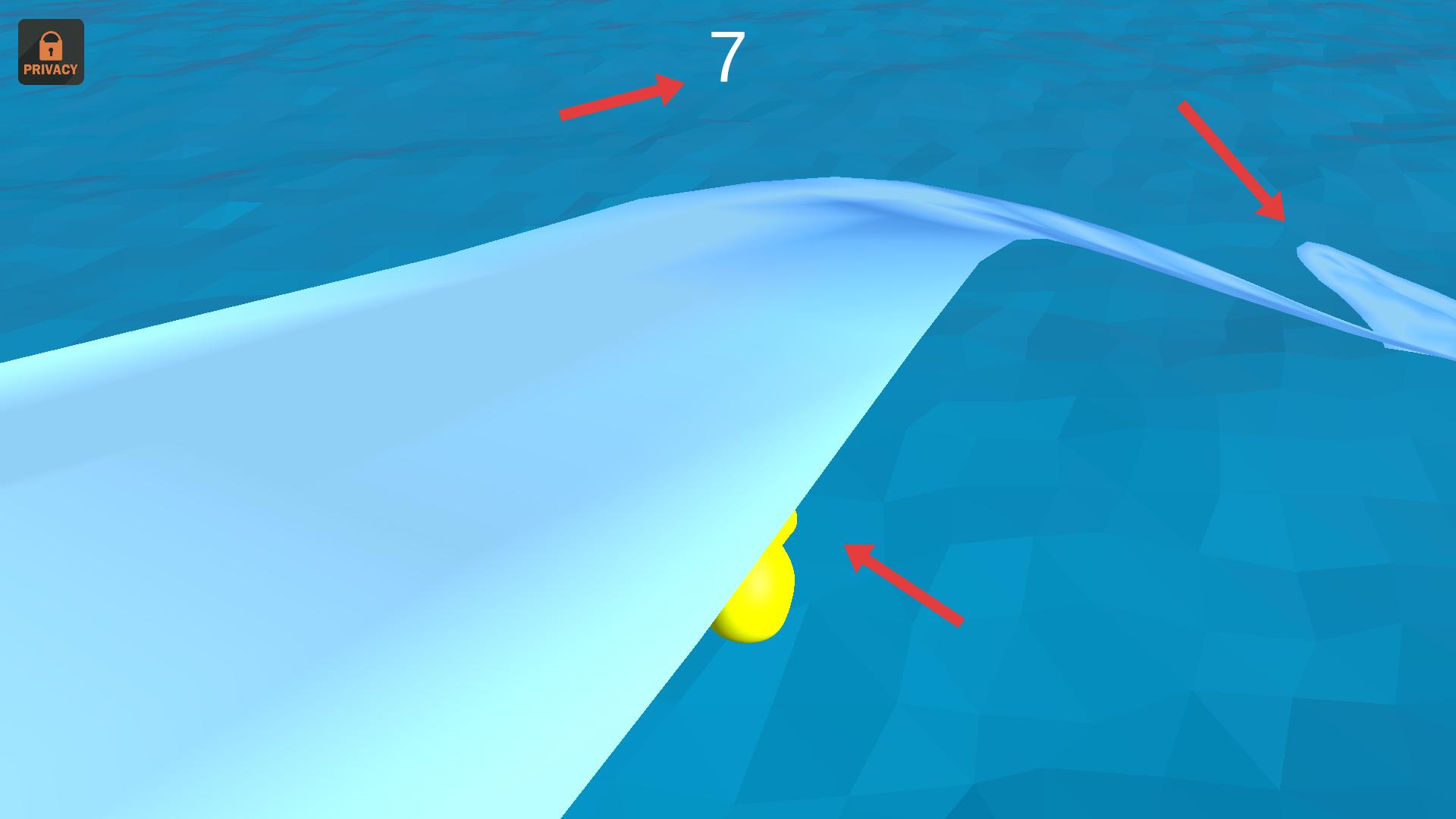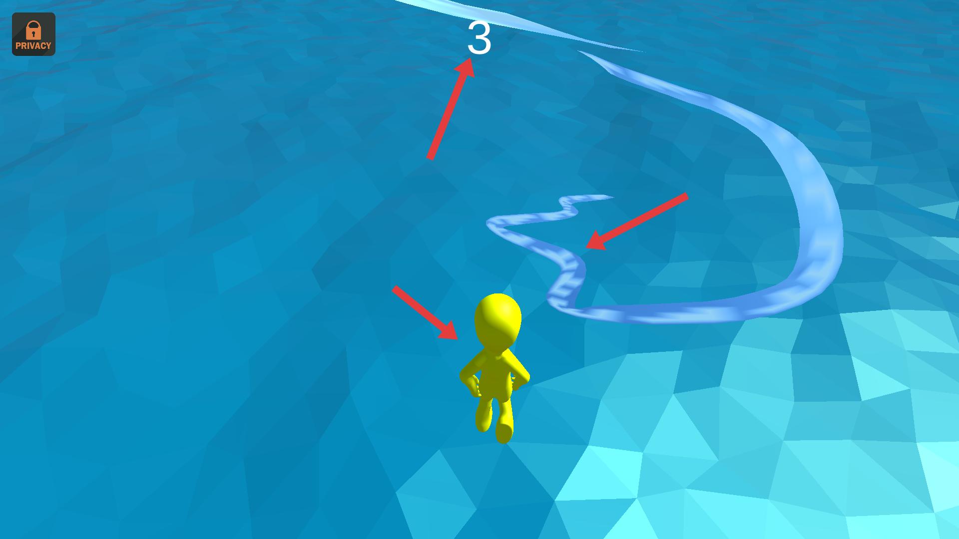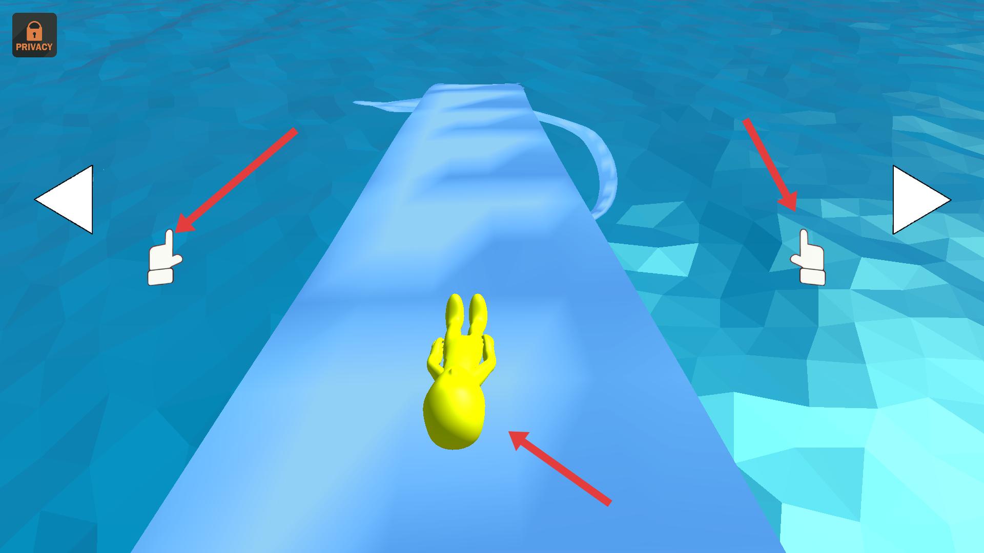1、游戲開(kāi)始角色在藍(lán)色滑道上,兩側(cè)有箭頭和手勢(shì)提示,需左右滑動(dòng)屏幕控制角色方向,保持在滑道上前進(jìn),避免掉落水中。