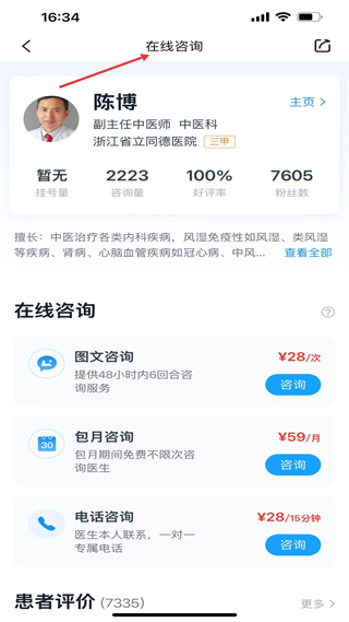 2、陳博在線咨詢有圖文、包月、電話三種方式,好評(píng)率100,粉絲7605,患者評(píng)價(jià)超7000條服務(wù)多樣。
