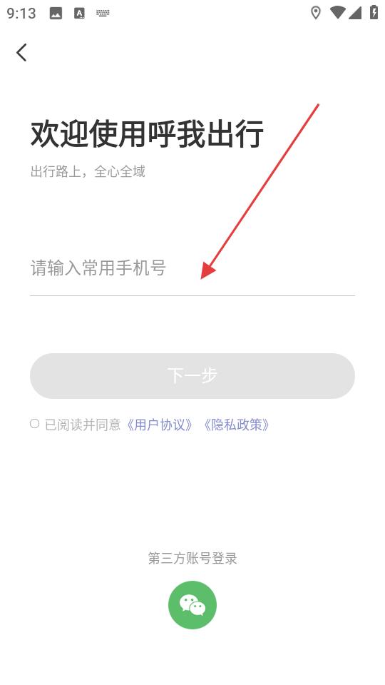 1、打開呼我出行手機(jī)版,進(jìn)入歡迎頁面,輸入常用手機(jī)號,勾選已閱讀并同意協(xié)議,點(diǎn)擊下一步,完成登錄準(zhǔn)備。