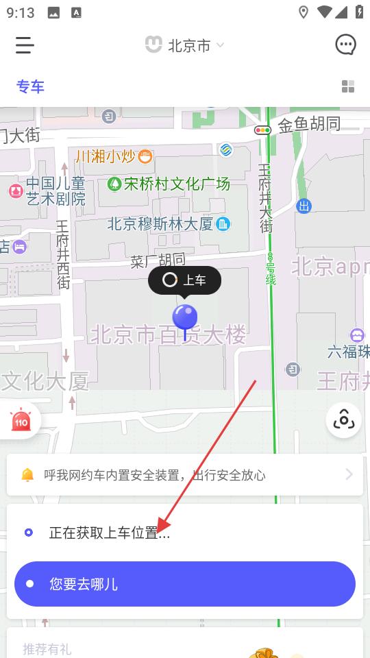 2、登錄后進(jìn)入地圖頁面,等待獲取上車位置,點(diǎn)擊您要去哪兒輸入目的地,發(fā)起用車需求。