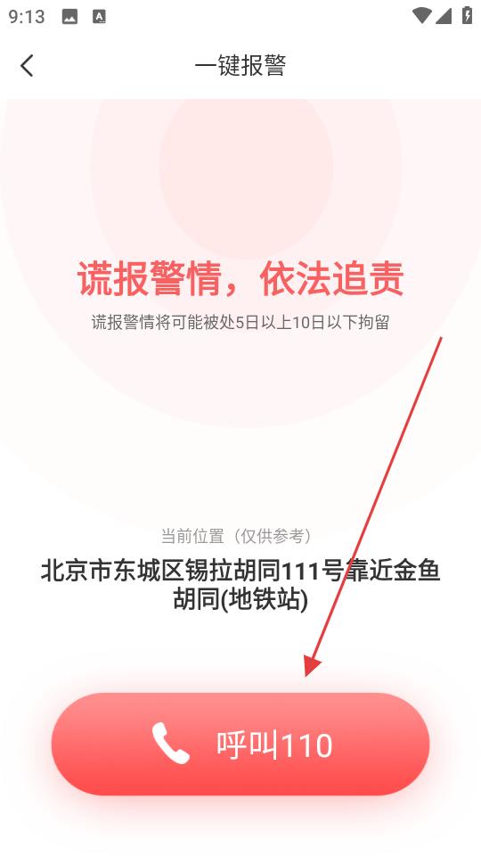 3、若遇緊急情況,進(jìn)入一鍵報(bào)警頁面,確認(rèn)當(dāng)前位置信息,點(diǎn)擊呼叫110按鈕,快速聯(lián)系警方求助。