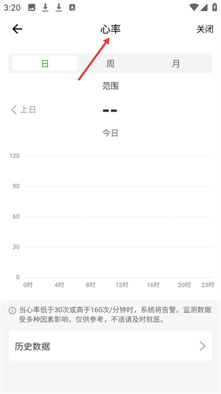 3、心率監(jiān)測(cè)板塊可按日、周、月查看心率數(shù)據(jù),系統(tǒng)會(huì)在心率異常時(shí)告警,數(shù)據(jù)僅供參考,不適需及時(shí)就醫(yī)。