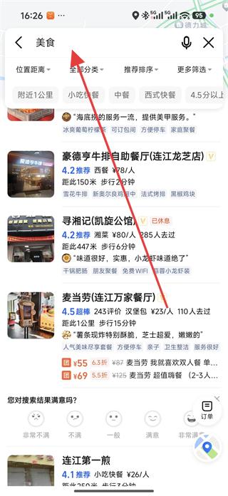 2、在美食搜索頁(yè)面,查看全部分類、推薦排序等篩選條件,瀏覽豪德亨牛排自助餐廳、尋湘記凱旋公館等美食店鋪列表。