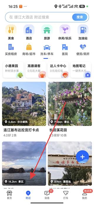 1、進(jìn)入軟件附近頁(yè)面,瀏覽美食、酒店、旅游等分類選項(xiàng)及連江版布達(dá)拉宮打卡點(diǎn)、長(zhǎng)田溪花田等推薦地點(diǎn),點(diǎn)擊美食進(jìn)入美食搜索頁(yè)面。