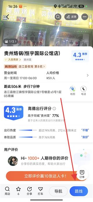 3、在店鋪詳情頁(yè)面,查看店鋪的評(píng)分、人均價(jià)格、營(yíng)業(yè)時(shí)間、用戶評(píng)價(jià)等信息,點(diǎn)擊路線,進(jìn)入路線規(guī)劃頁(yè)面。