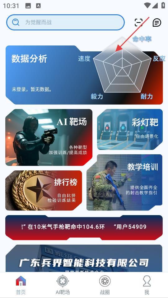 1、首頁有搜索欄,展示數(shù)據(jù)分析、能力雷達(dá)圖,含AI靶場等功能模塊,還有射擊成績動態(tài)及公司信息。