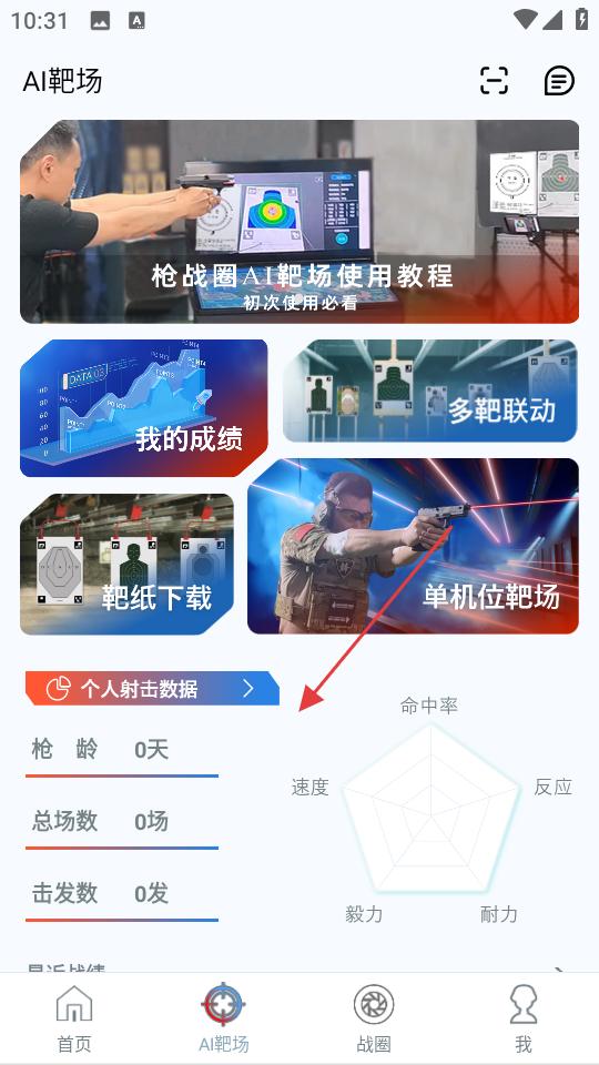 2、AI靶場頁,有使用教程,可看我的成績、多靶聯(lián)動等,顯示個人射擊數(shù)據(jù)及能力雷達(dá)圖。