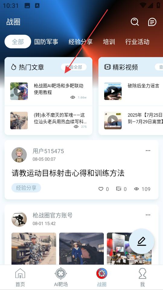 3、戰(zhàn)圈頁,分國防軍事等分類,有熱門文章、精彩視頻,用戶可交流射擊心得,官方賬號分享內(nèi)容,支持發(fā)布新帖。