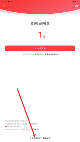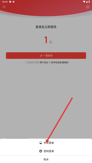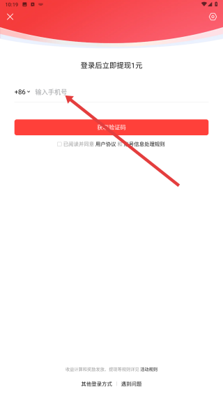 1、進(jìn)入界面能看到登錄后立即提現(xiàn)1元提示,還有一鍵登錄按鈕,下方有已閱讀并同意相關(guān)協(xié)議的勾選框。