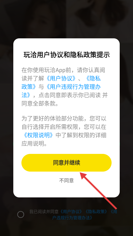 1、打開玩洽App首先呈現(xiàn)用戶協(xié)議和隱私政策提示,需認真閱讀相關(guān)條款,點擊同意并繼續(xù)才能進入應(yīng)用。