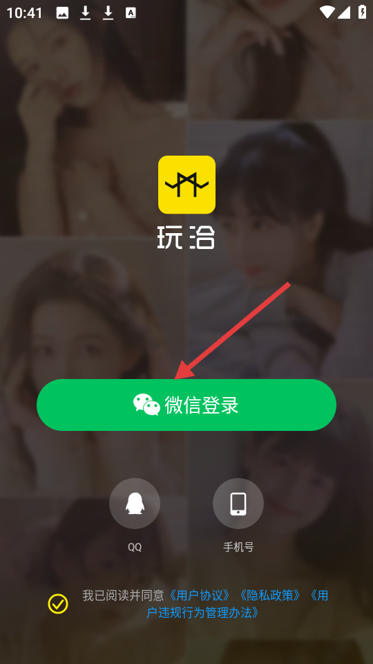 2、進入登錄界面玩洽提供多樣登錄方式,醒目的微信登錄按鈕便于用戶快速選擇社交賬號登錄。