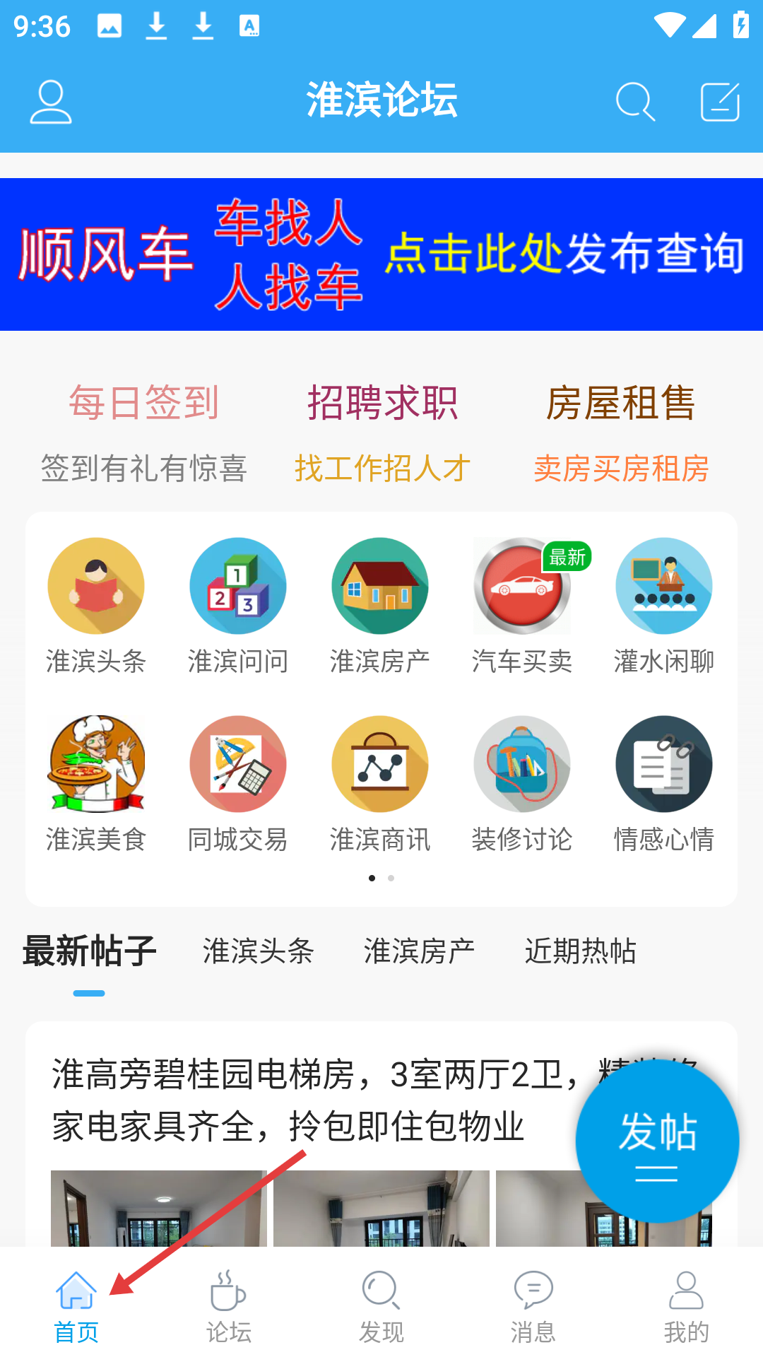 1、首頁(yè)有順風(fēng)車(chē)發(fā)布查詢(xún)?nèi)肟?,含每日簽到、招聘求職等板塊,還有淮濱頭條、房產(chǎn)等功能分類(lèi),展示最新帖子如淮高旁碧桂園房屋租售信息。