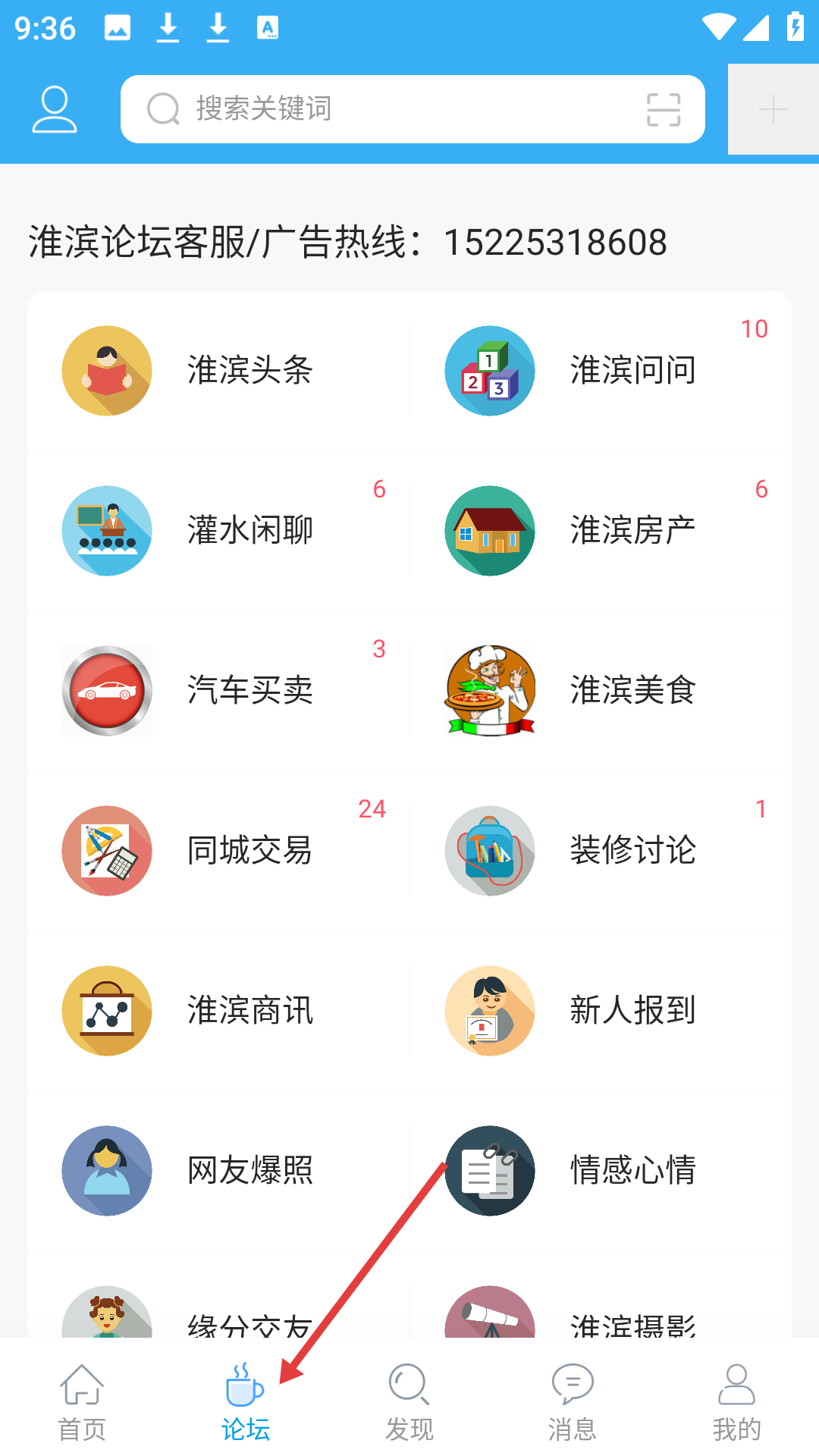 2、論壇頁(yè)面有搜索欄與客服廣告熱線,羅列淮濱頭條、灌水閑聊等眾多分類(lèi)板塊,方便用戶(hù)參與不同話(huà)題討論。