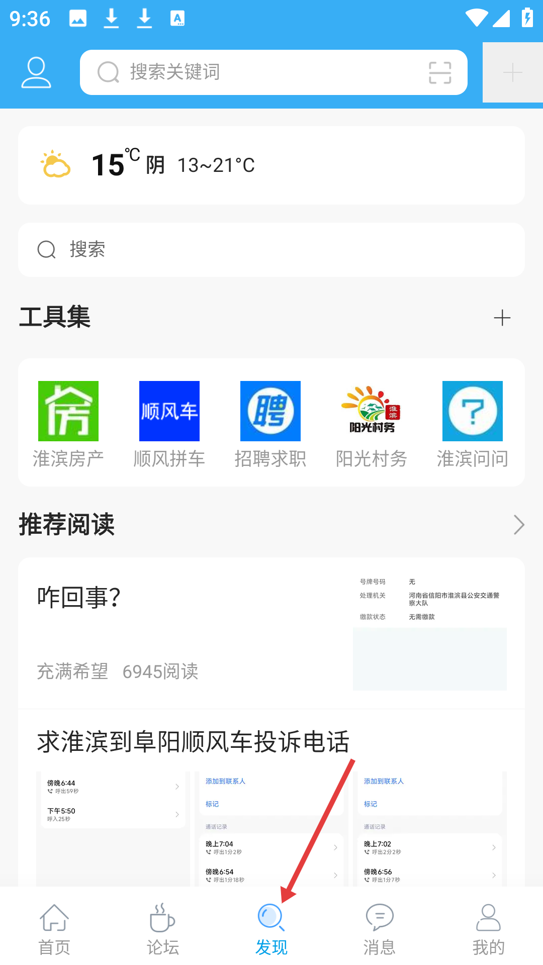 3、發(fā)現(xiàn)頁(yè)面顯示天氣信息,有工具集含淮濱房產(chǎn)、順風(fēng)拼車(chē)等實(shí)用功能,還有推薦閱讀板塊,呈現(xiàn)咋回事等熱門(mén)內(nèi)容。