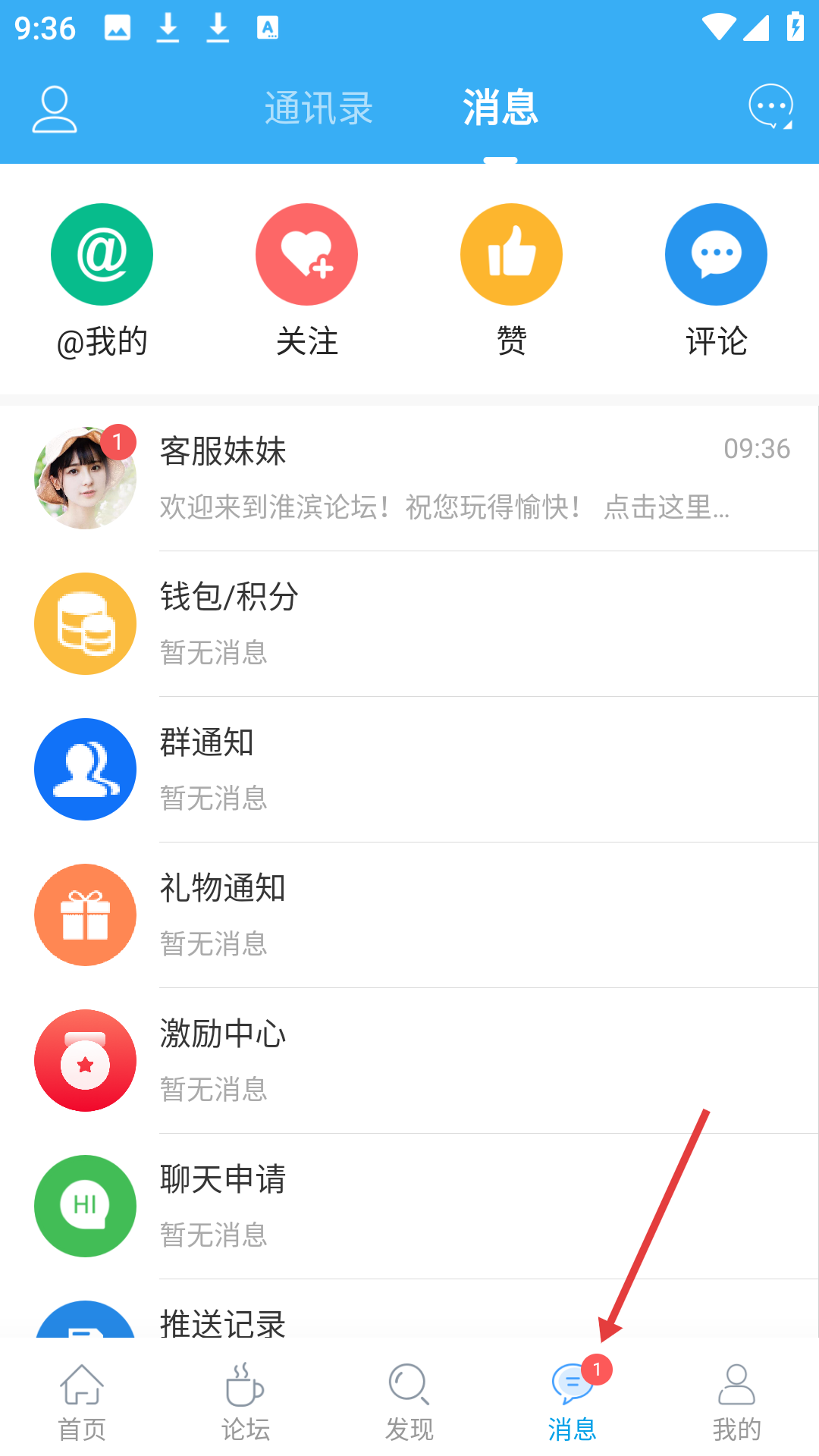 4、消息頁(yè)面分通訊錄和消息欄,有我的、關(guān)注等互動(dòng)入口,展示客服妹妹歡迎語(yǔ),還有錢(qián)包積分、群通知等消息分類(lèi)。