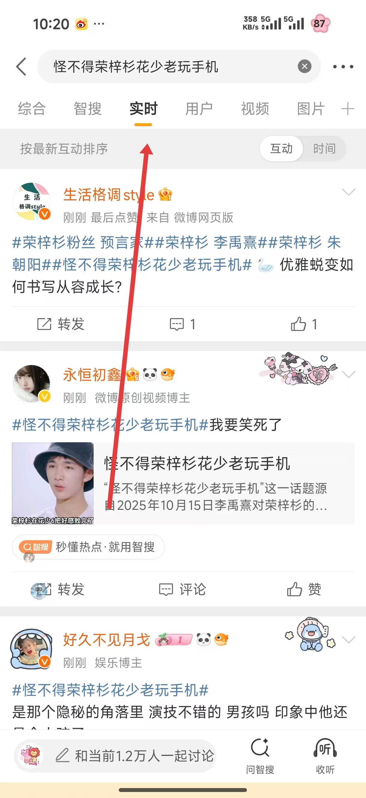 4、在相關(guān)內(nèi)容頁面,看到實時標(biāo)簽,點擊該標(biāo)簽,查看該熱搜詞條下的實時互動內(nèi)容。